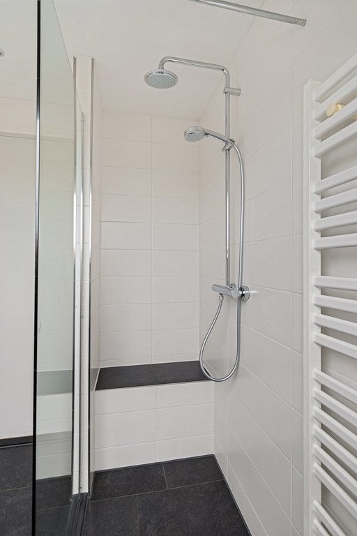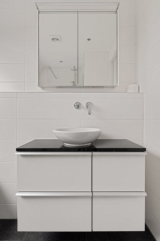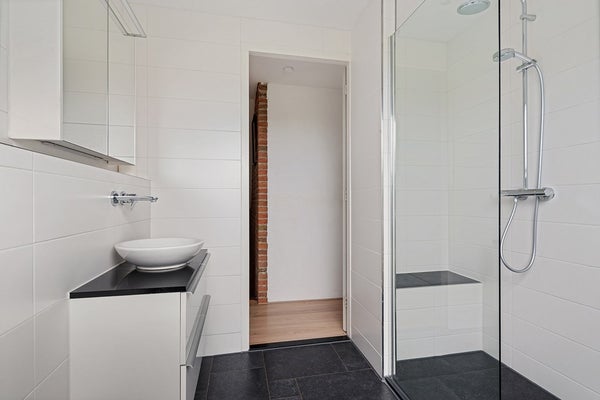Il bagno centrale è dotato di doccia a filo pavimento, WC e mobile bagno con lavabo.