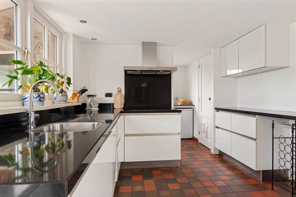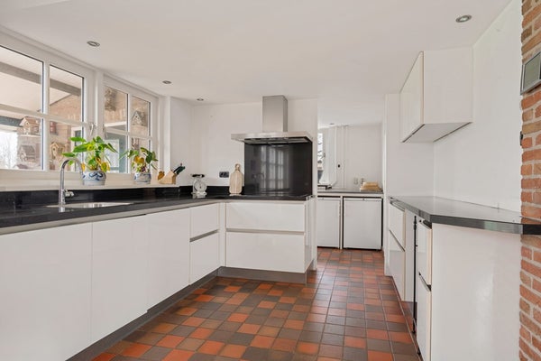 La cucina open space di lusso è dotata di lavastoviglie, lavello, piano cottura e cappa aspirante. Il piano di lavoro in composito conferisce alla cucina un aspetto di alta qualità.