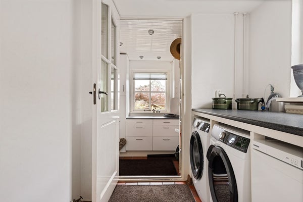 Entrata sul retro, corridoio con angolo cottura. Dal corridoio accesso alla lavanderia con installazione per lavatrice e asciugatrice e un frigorifero e congelatore separati.