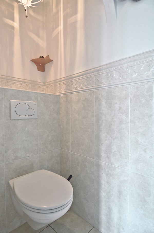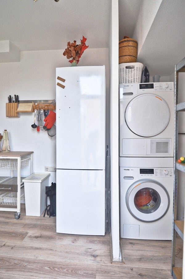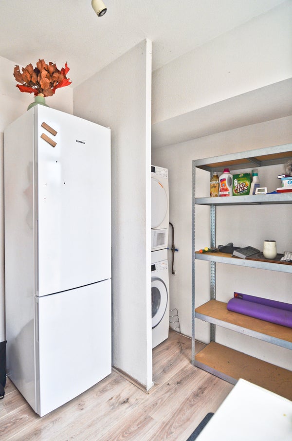 Accedi alla casa tramite il giardino anteriore di circa 25 m². L'ingresso dà accesso a un wc separato e al luminoso soggiorno con cucina a vista. La cucina è attrezzata con vari elettrodomestici da incasso di alta qualità. Adiacente si trova il locale tecnico con lavatrice e asciugatrice Miele.