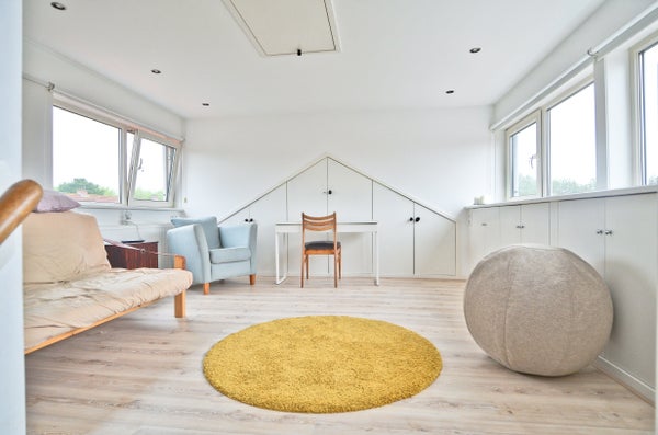 Una camera matrimoniale particolarmente luminosa e spaziosa, dotata di finestre a falda e finestre su entrambi i lati, che garantiscono una piacevole luminosità e una sensazione di spazio.
