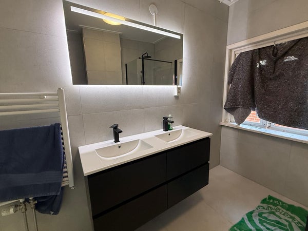 En entrant, vous arrivez dans le hall, qui donne accès à toutes les chambres et les espaces communs. Le logement est actuellement partagé avec un colocataire masculin. La cuisine est équipée d'une plaque de cuisson à induction, d'un réfrigérateur, d'un lave-vaisselle et d'un four combiné/micro-ondes. La salle de bain se trouve au deuxième étage et dispose d'une douche, d'un toilet, d'un lavabo pour plusieurs personnes et d'un meuble vasque. Les chambres sont situées au premier étage et ont une superficie de respectivement 16,92 m² et 23,74 m².