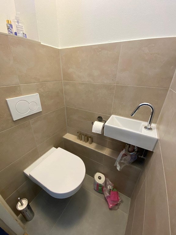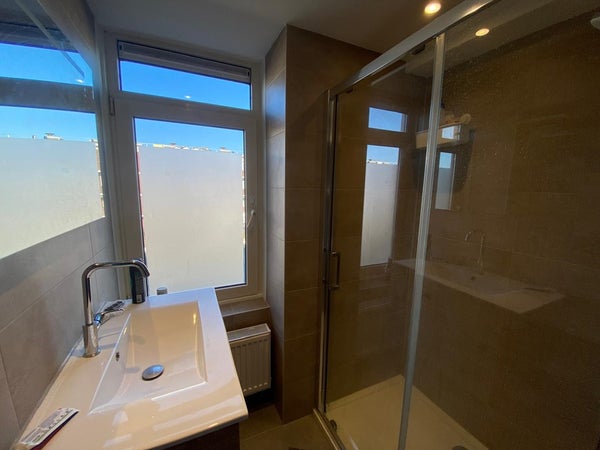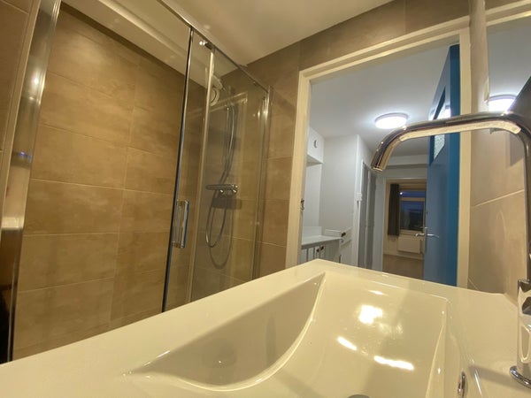 La propriété se trouve au premier étage de l'immeuble. Vous entrez dans le hall partagé, qui donne accès à la cuisine commune, équipée d'une hotte aspirante, d'une plaque de cuisson au gaz, d'un four et d'un lave-vaisselle, ainsi qu'au salon d'environ 22 m² et aux toilettes. Les chambres se trouvent au deuxième étage. La chambre 3 fait environ 6 m². Enfin, il y a une salle de bain d'environ 3 m², équipée d'une douche et d'un lavabo.