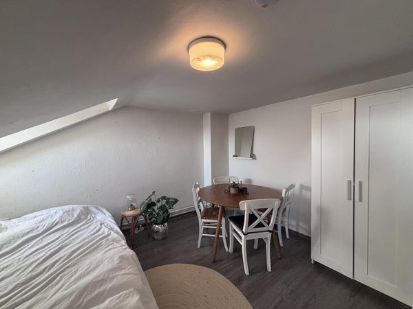 La chambre disponible se trouve au deuxième étage. Ici, il y a au total deux chambres et un salon/salle à manger commun pour se détendre ou manger ensemble. En outre, il y a une pièce de rangement séparée pour un espace de stockage supplémentaire.