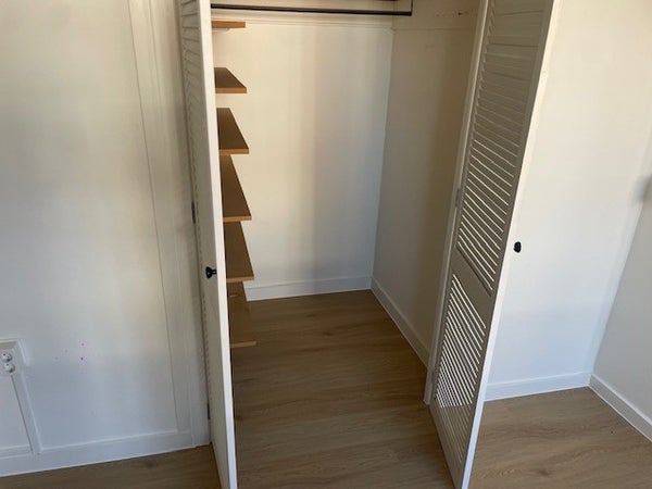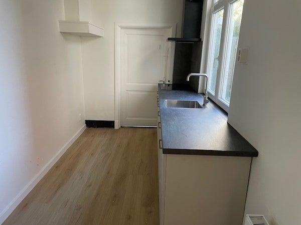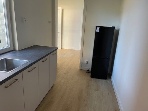 La toute nouvelle cuisine est partagée avec trois autres résidents. La cuisine est équipée d'un réfrigérateur avec congélateur, d'une plaque de cuisson électrique et d'une hotte.