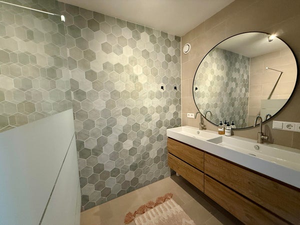 - Walk-in-Duschkabine und Waschbecken