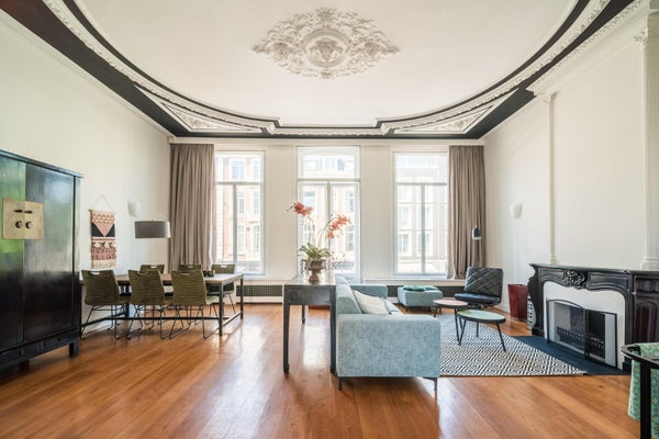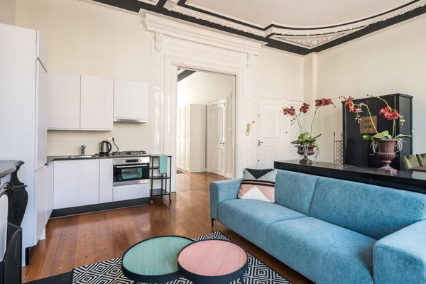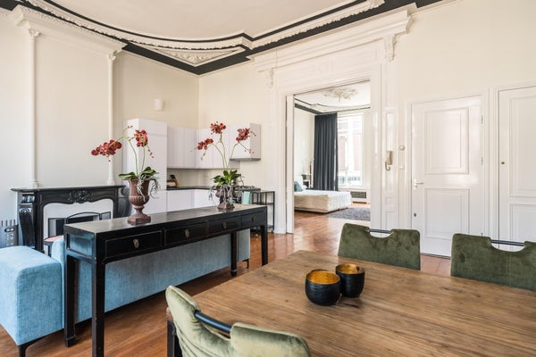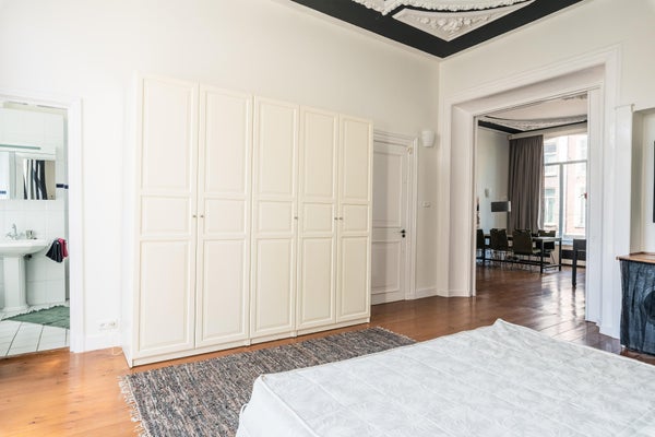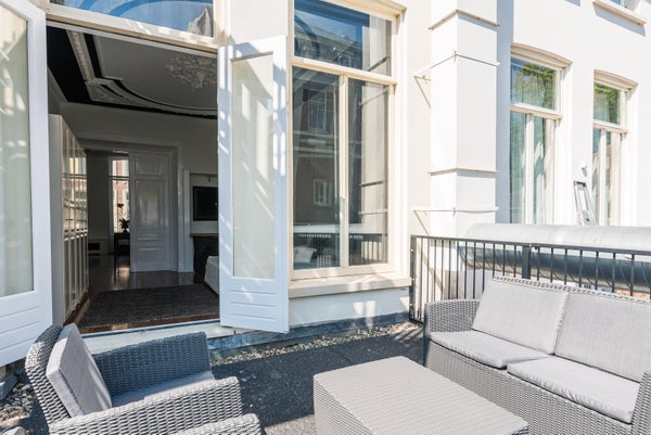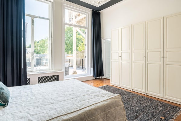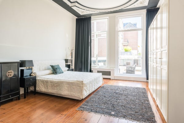 Diese Wohnung ist teilweise möbliert. Die Lage ist außergewöhnlich, nur 50 Meter von der Brücke über den Vondelpark und auf der anderen Seite die bekannte P.C. Hooftstraat. Also direkter Zugang zum Vondelpark, aber auch zum Leidseplein, das nur wenige Gehminuten entfernt ist. Restaurants und ein Supermarkt gleich um die Ecke. Kürzlich wurde die gesamte Wohnung mit HR++-Glas ausgestattet. Das geräumige Wohnzimmer befindet sich an der Vorderseite und blickt auf die van Baerlestraat. Auf der ruhigen Rückseite befindet sich das außergewöhnlich große Schlafzimmer mit dem Badezimmer daneben. Hier gibt es auch Zugang zur sonnigen Dachterrasse.