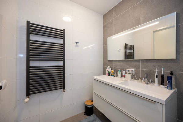 Zentral in der Wohnung liegt das großzügige Badezimmer mit Dusche und einem Doppelwaschbecken. Darüber hinaus gibt es eine separate hängende Toilette mit Waschbecken. Der separate Schrank mit Anschlüssen für Waschmaschine und Trockner bietet zudem zusätzlichen Stauraum.