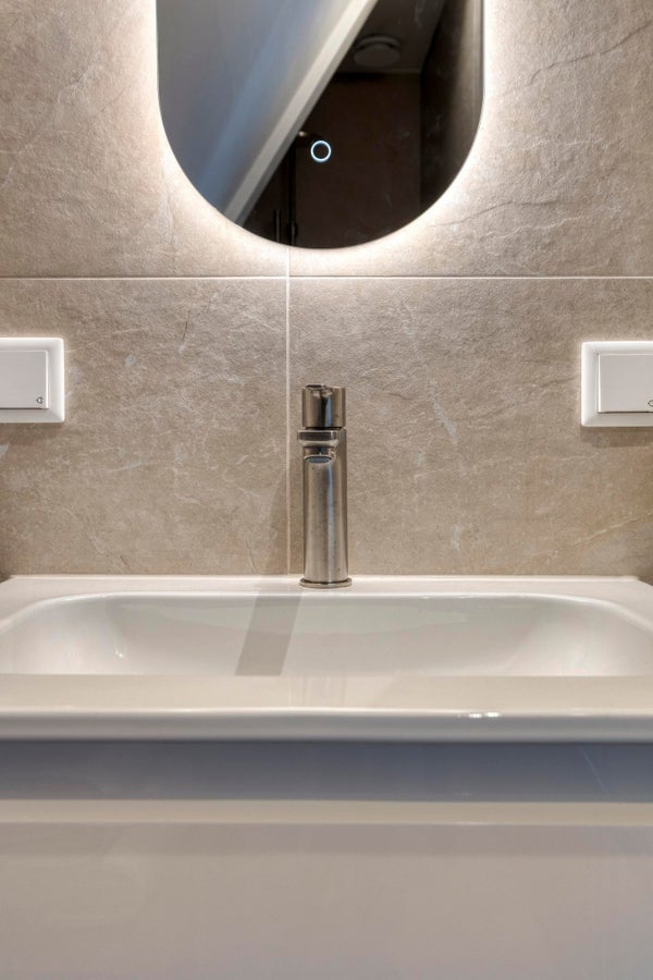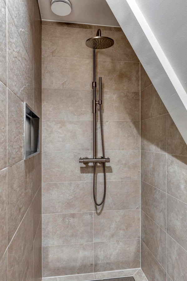 Die Wohnung verfügt über ein Schlafzimmer: auf der ruhigen Rückseite. Das Badezimmer ist modern mit einer begehbaren Dusche, einem Waschbecken und einer Toilette gestaltet und fügt sich nahtlos in die stilvolle Ausstattung des restlichen Apartments ein.
