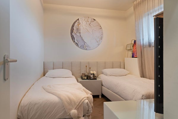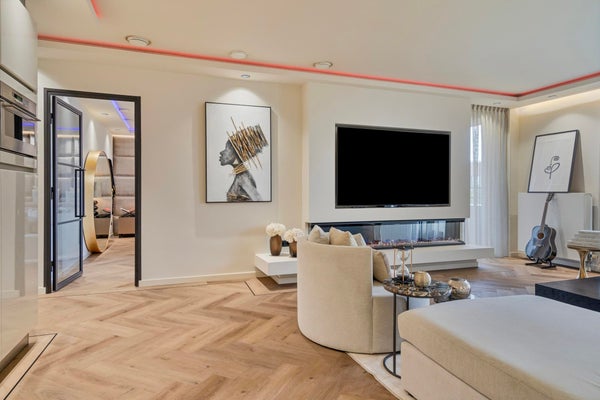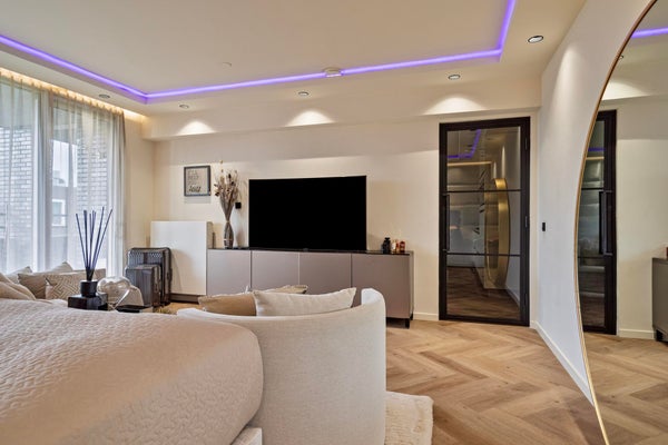 Durch das schöne und großzügige Wohnzimmer (mit Tür zum Balkon) mit viel Licht durch die 3 großen Fenster und einem unverbauten Blick auf den Park und das Wasser. Die Küche ist ausgestattet mit einem Kombi-Ofen, einem Dampfgarer und einem separaten Gefrierschrank. Es gibt ein sehr schönes Hauptschlafzimmer und ein Arbeits- oder Kinderzimmer. Das Hauptschlafzimmer befindet sich zur Parkseite und Schiebetüren bieten Zugang zum wunderbar tiefen Balkon mit Blick auf den Park und den IJ-See. Das Badezimmer ist modern mit einer begehbaren Dusche und einem Waschbecken.