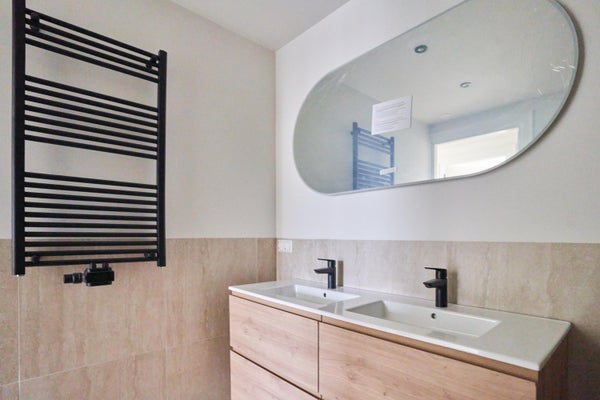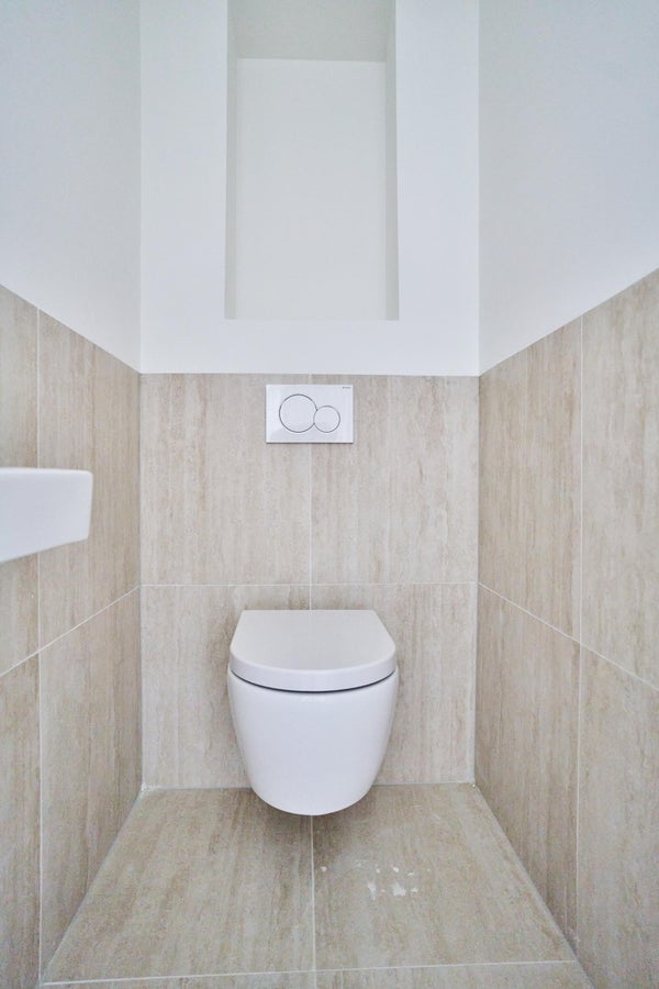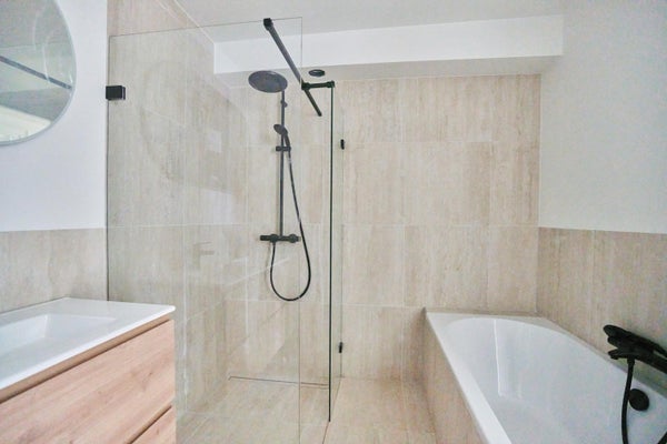 Das Badezimmer verfügt über Einbauleuchten, ein Doppelwaschbecken mit Möbel, eine Regendusche und eine Badewanne. Die Toilette mit Waschbecken befindet sich in einem separaten Raum neben dem Badezimmer, und die Waschanschlüsse sind sauber in einem separaten Abstellraum untergebracht. Die Wohnung ist wunderschön mit PVC-Laminatboden und Fußbodenheizung ausgestattet.
