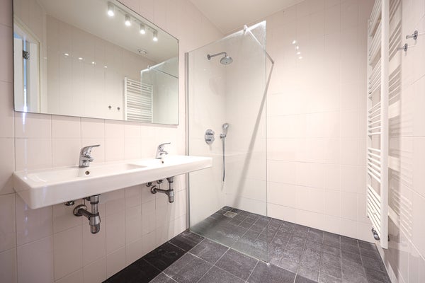 Zwei gleich große Schlafzimmer von ca. 12 m². Das moderne Badezimmer ist mit einer begehbaren Dusche mit zwei Duschköpfen, einem Handtuchheizkörper und einem Doppelwaschbecken ausgestattet.