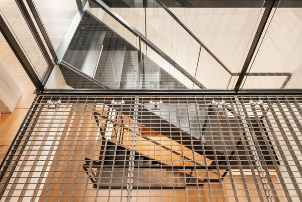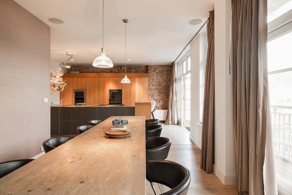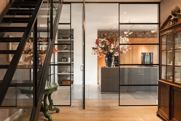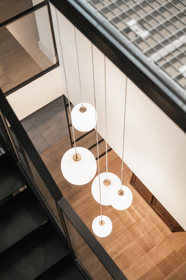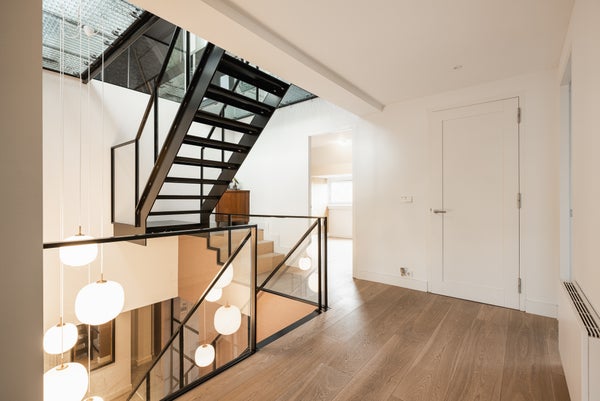 Die Ausführung ist außergewöhnlich, mit schönen deckenhohen Türen und Fenstern, die überall für viel Licht sorgen, Holzböden, zwei Gas-Kamins, einer offenen Designer-Küche von Bulthaup mit Gaggenau-Geräten und einer beeindruckenden Treppe im Innenbereich, die dem Ganzen einen modernen, offenen und einzigartigen Look verleiht.