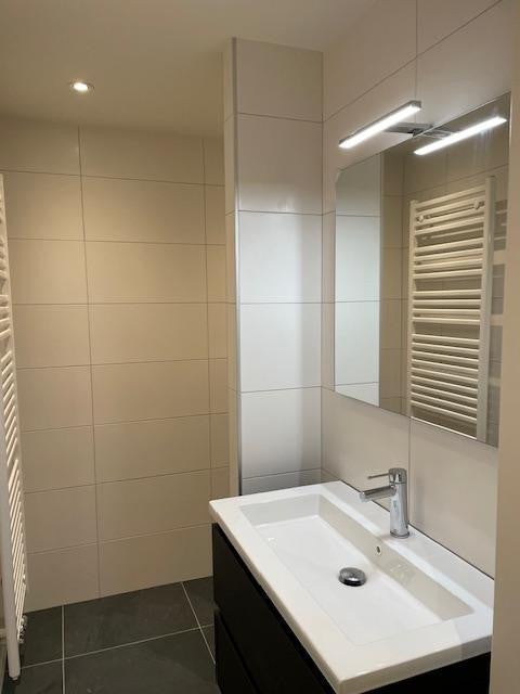 - (Teilweise) gefliester Badezimmer mit begehbarer Dusche mit Glasscheibe und Waschbecken mit Spiegel;