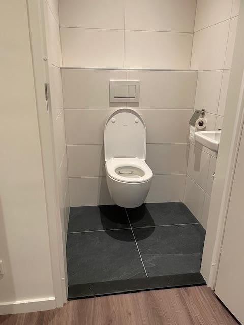 - (Teilweise) gefliester Toilettenraum mit schwebendem WC und Waschbecken;