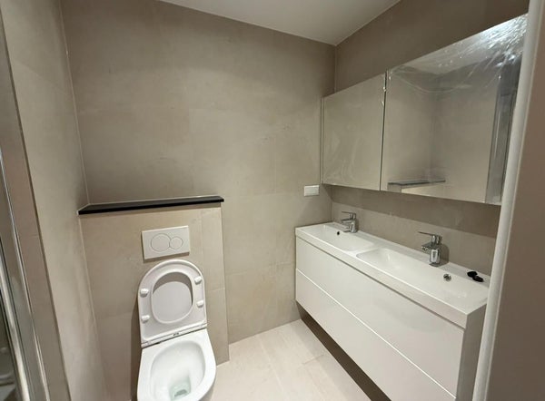 Das moderne Badezimmer ist ein echter Hingucker: ausgestattet mit einem doppelten Waschbecken, einer geräumigen begehbaren Dusche und einer Toilette, alles in einem frischen, zeitgemäßen Stil.