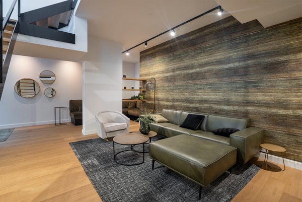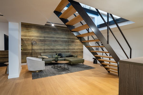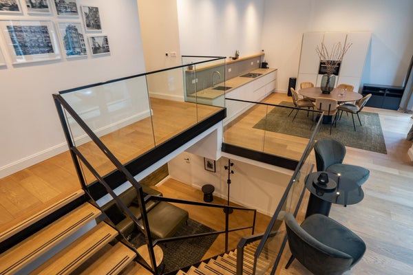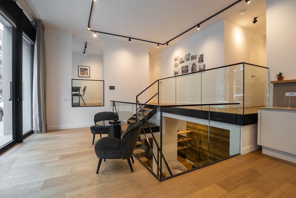Man betritt die Wohnung direkt von der Straße durch massive Glastüren, durch die das natürliche Licht leicht durch die gesamte Wohnung strömt.