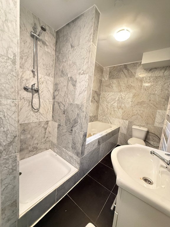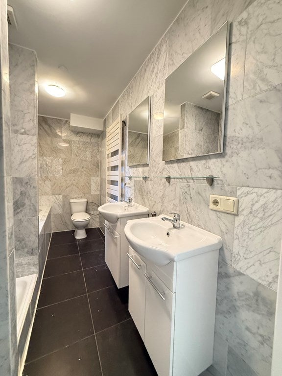 Das Badezimmer ist ausgestattet mit Dusche, Badewanne, zwei Waschbecken und einem Anschluss für die Waschmaschine/Trockner. Separates WC vorhanden.