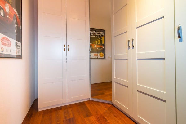 Geräumiges Hauptschlafzimmer mit großem Kleiderschrank an der Vorderseite. Das zweite Schlafzimmer an der Vorderseite der Wohnung kann auch als Büro/Kleiderzimmer mit großem Kleiderschrank genutzt werden. Badezimmer mit Dusche und Badewanne.