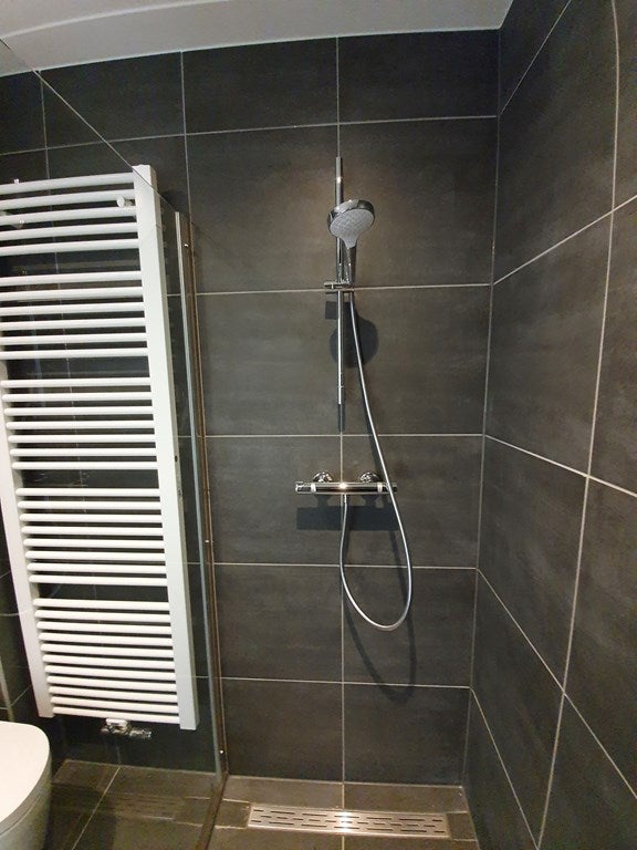 Das Badezimmer verfügt über eine begehbare Dusche und eine Toilette.