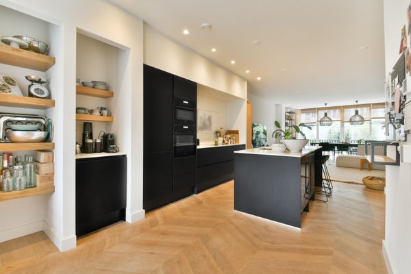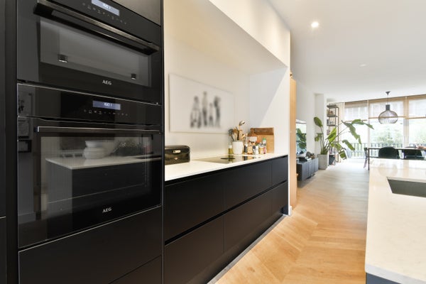 Die matte schwarze Küche ist grifflos und verfügt über Einbaugeräte von AEG, wie z.B. eine Kombi-Mikrowelle, Backofen, Kühlschrank, Induktionskochfeld und Geschirrspüler. Außerdem ist sie mit einem Quooker und einem Weinklimaschrank ausgestattet. Die Arbeitsplatte besteht aus einem sehr langlebigen Verbundwerkstoff mit einer Marmoroptik und der Bartresen lädt ein, beim Kochen zu entspannen. Neben der Küche wurde zusätzlicher Stauraum geschaffen.