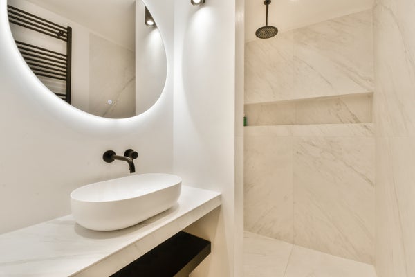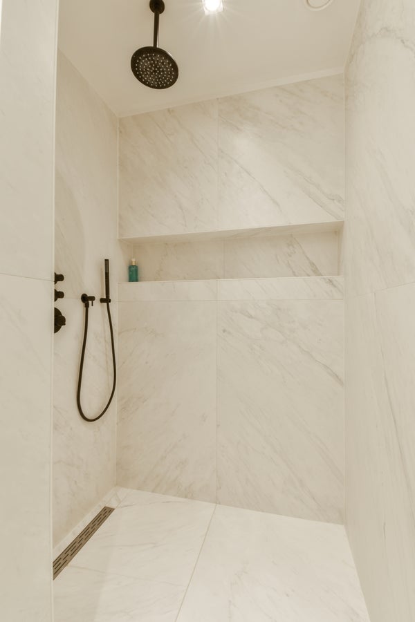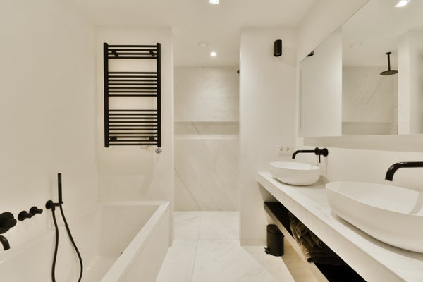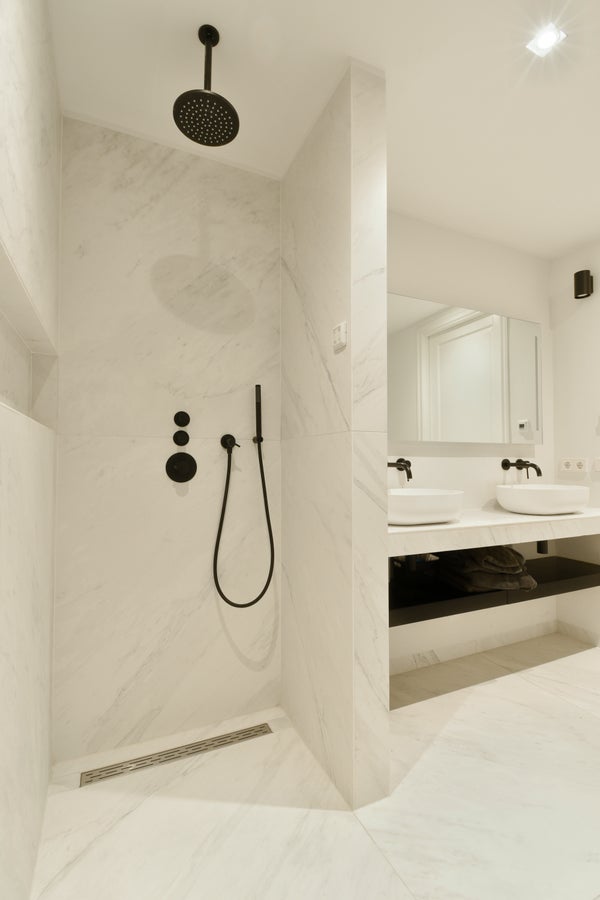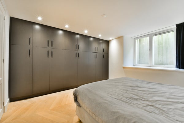 Die Schlafräume des Hauses befinden sich im Untergeschoss. Das Hauptschlafzimmer ist sehr geräumig, wobei viel Stauraum geschaffen wurde. Dieses Schlafzimmer verfügt außerdem über ein eigenes Badezimmer en suite mit u.a. einer Doppel-Dusche, Badewanne, Doppelspülbecken und Fußbodenheizung. Die schwarzen Armaturen bilden einen schönen Kontrast zu den großen Fliesen an Wänden und Boden. Bei der Planung des Badezimmers wurde auch an die effiziente Nutzung des Raumes gedacht, indem beispielsweise Nischen in den Duschen eingerichtet wurden.