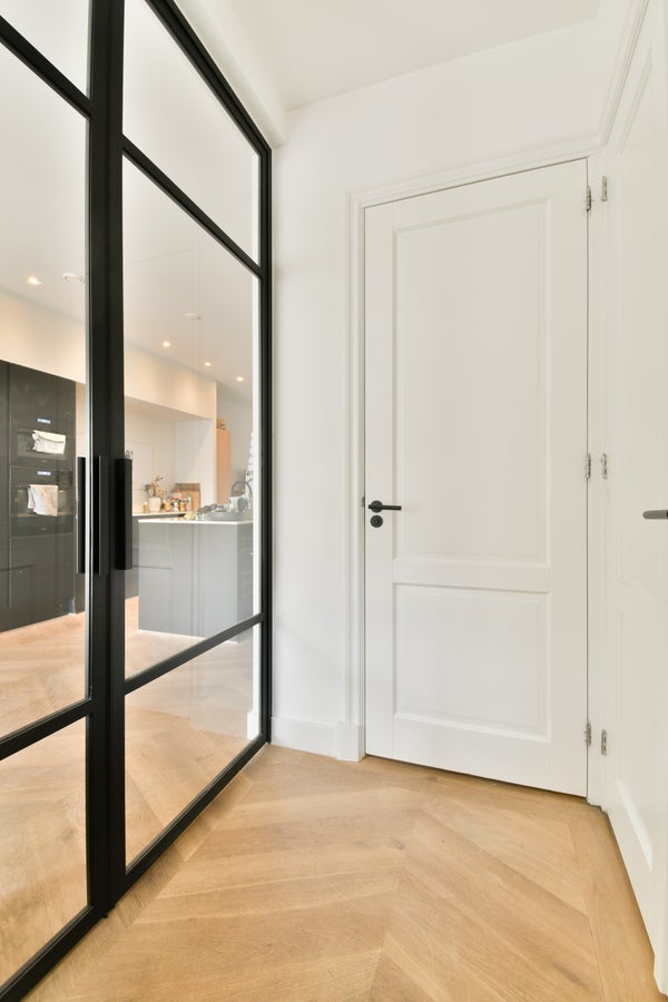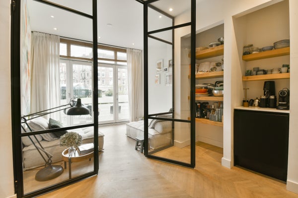 Eingang, Sie betreten durch Ihre eigene Haustür vom Treppenhaus. An der Vorderseite der Wohnung wurde ein multifunktionaler Raum geschaffen. Dieser ist derzeit als zusätzlicher Sitzbereich eingerichtet, aber natürlich wäre dieser Raum auch sehr nützlich als beispielsweise Büro oder zum Parken Ihres E-Bikes oder Kinderwagens. Durch die großen industriellen Stahltüren haben Sie immer Kontakt mit dem Rest des Hauses und genießen außerdem das Licht. Außerdem haben Sie von diesem Raum aus einen Blick auf die charakteristischen Gebäude an der Da Costakade. Die große Fassade zum Kanal kann komplett geöffnet werden.