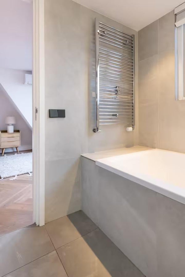Die Wohnung verfügt über zwei geräumige Schlafzimmer mit Badezimmer en suite. Das erste Bad ist sehr groß und luxuriös ausgestattet mit einer Badewanne, zusätzlichem Stauraum, Fußbodenheizung, einer Toilette, einer begehbaren Dusche und passenden Badezimmermöbeln. Das zweite Bad bietet eine praktische begehbare Dusche, eine Toilette und ein Waschbecken, wodurch Komfort und Bequemlichkeit für Sie und Ihre Familie garantiert sind.