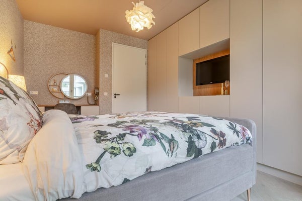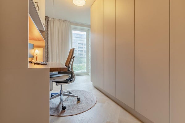 Das Hauptschlafzimmer ist durch die Halle erreichbar. Dieses Schlafzimmer ist sehr geräumig und bietet ein Doppelbett sowie viel Stauraum. Das zweite Schlafzimmer verfügt über einen eingebauten Schreibtisch und Schränke. Das dritte Schlafzimmer hat ebenfalls einen eingebauten Kleiderschrank. Das moderne Badezimmer ist ausgestattet mit einer ebenerdigen Dusche mit luxuriöser Regendusche und Sunshower, einer Badewanne mit luxuriösem Whirlpool, Toilette und einem maßgefertigten Waschtisch. Die 2. Toilette ist über die Halle erreichbar. Es gibt auch einen Abstellraum mit Bosch Waschmaschine-Trockner. Die gesamte Wohnung ist mit Eichenparkett im Fischgrätmuster mit Fußbodenheizung ausgestattet.