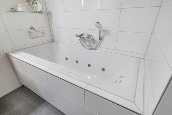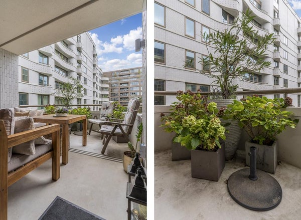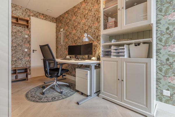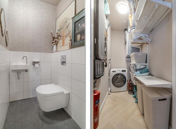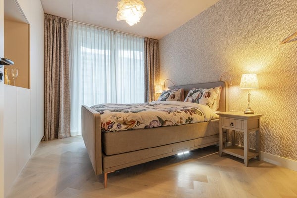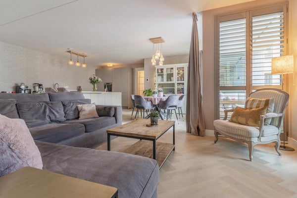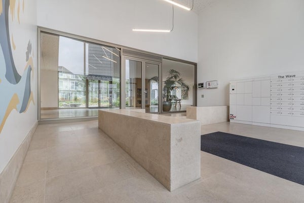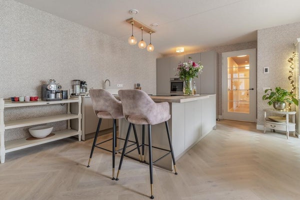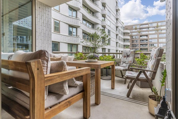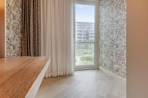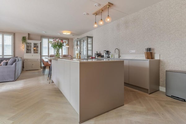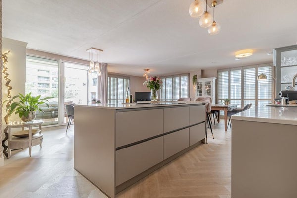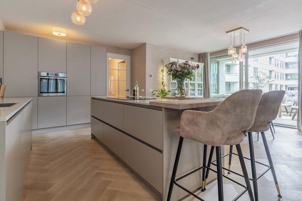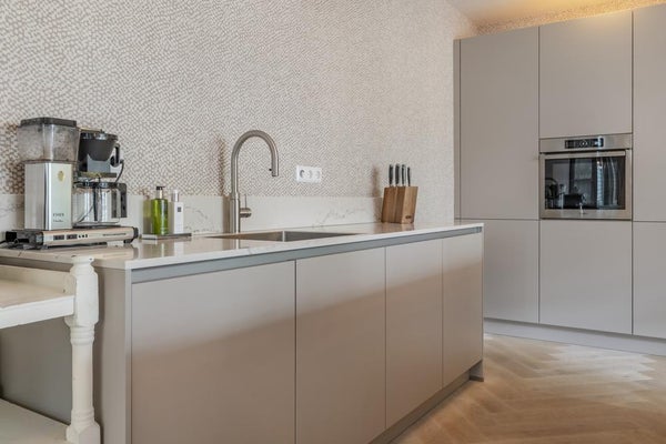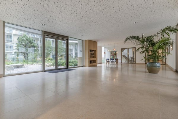 Imposanter Eingang mit Treppenhaus und Aufzug, der Zugang zur 1. Etage gewährt. Das geräumige und helle Wohnzimmer ist geschmackvoll eingerichtet und verfügt über eine Schiebetür und eine moderne offene Küche. Die Küche ist mit allen Annehmlichkeiten ausgestattet, wie einem Ofen, Geschirrspüler, Quooker, BORA-Induktionskochfeld und einem großen Kühlschrank mit Gefrierfach. Über die Schiebetür im Wohnzimmer erreichen Sie den geräumigen Balkon (ca. 11m2), der auf den ruhigen und grünen Innenhof blickt.