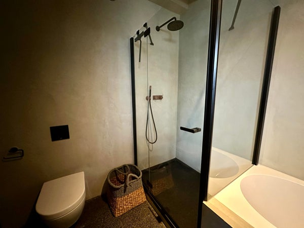 - Modernes Badezimmer mit Badewanne, begehbarer Dusche, Waschbecken und WC