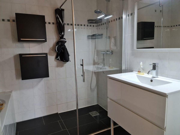 Die Wohnung verfügt über zwei Schlafzimmer, darunter das geräumige und helle Hauptschlafzimmer. Das moderne Badezimmer verfügt über eine Badewanne, eine begehbare Dusche, ein Waschbecken und einen Designheizkörper. Die Toilette mit Waschbecken ist separat und befindet sich in der Halle, ebenso wie der Abstellraum/Wäscheraum mit Heizungsanlage und Waschmaschine/Trockner.