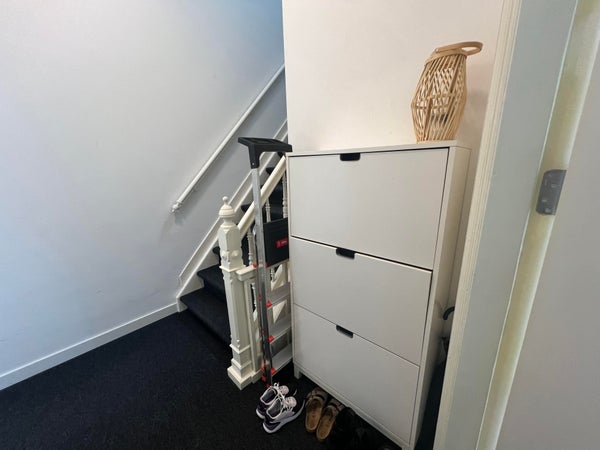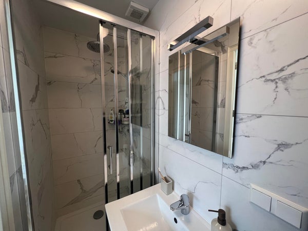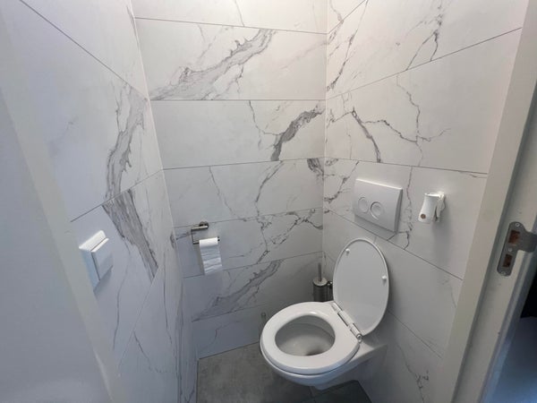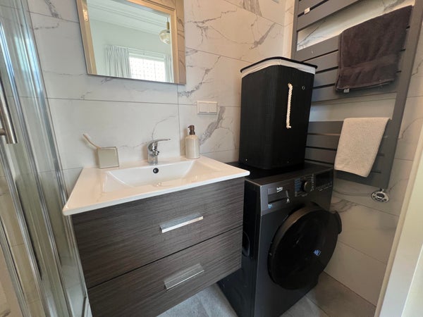 Von der Rückseite des Gebäudes aus sind die 5 Wohnungen zu erreichen, von denen sich diese Wohnung im 1. Obergeschoss befindet. Der Flur gibt Zugang zur Küche, einem separaten WC und dem Schlafzimmer. Die gesamte Wohnung ist mit einem modernen Laminatboden ausgestattet. Die Küche ist mit einem eingebauten Geschirrspüler, Induktionskochfeld, Dunstabzugshaube, Kombi-Backofen-Mikrowelle und Kühlschrank mit Gefrierfach ausgestattet. Das Badezimmer verfügt über ein Waschbeckenmöbel mit 2 Schubladen und eine Duschkabine mit (optional) Regen Dusche, die vom Schlafzimmer aus zugänglich ist.