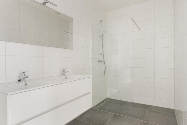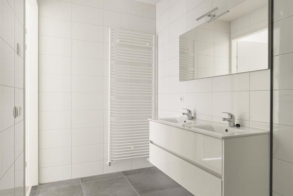 Außerdem ist das Badezimmer mit einer separaten Dusche und einem Doppelwaschbecken (und Wasserhähnen) mit einem großen Spiegel ausgestattet. Auch das Badezimmer und das separate WC sind mit einer eleganten Fliesenverarbeitung versehen.