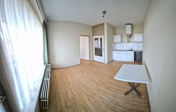 Wohn- und Schlafzimmer liegen beide auf der Balkonseite. Die offene Küche wird derzeit renoviert, ebenso wie die Malerarbeiten in der gesamten Wohnung.