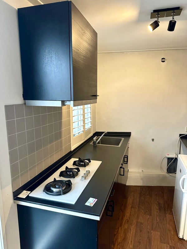 - Küche, ausgestattet mit Kühlschrank, einem 3-Brenner-Gasherd und Dunstabzugshaube.