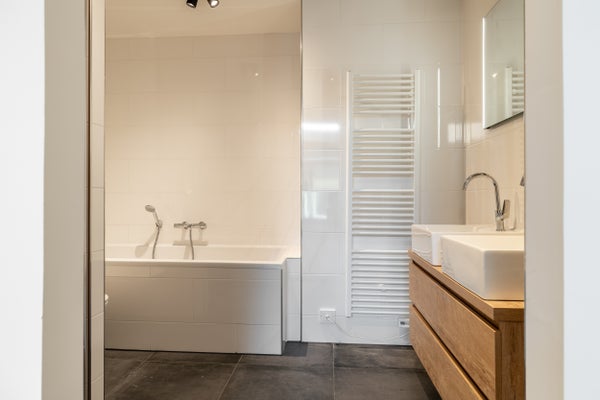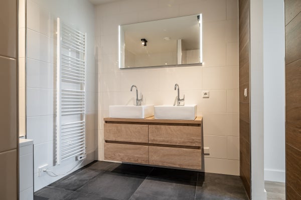 Badezimmer I: ausgestattet mit einem modernen Waschtisch mit Doppel-Waschbecken, einer begehbaren Dusche, einer Badewanne und einem WC.