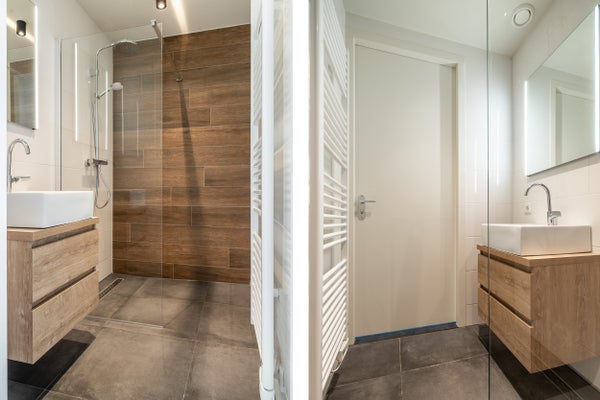 - Vollständig gefliester Badezimmer mit modernem Waschtisch und einer begehbaren Dusche mit Regen- und Handbrause.