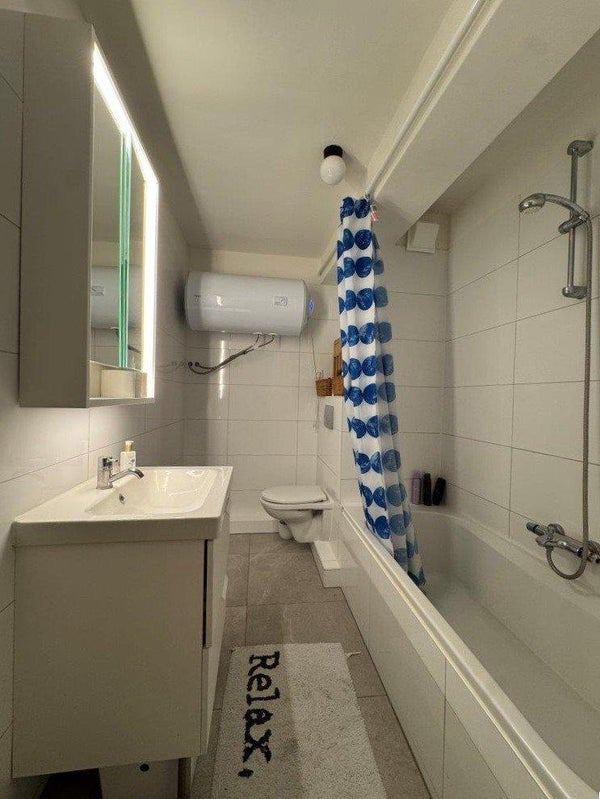 Badezimmer mit Bad/Duschkombination, wandhängender Toilette und Waschbecken mit Möbeln.