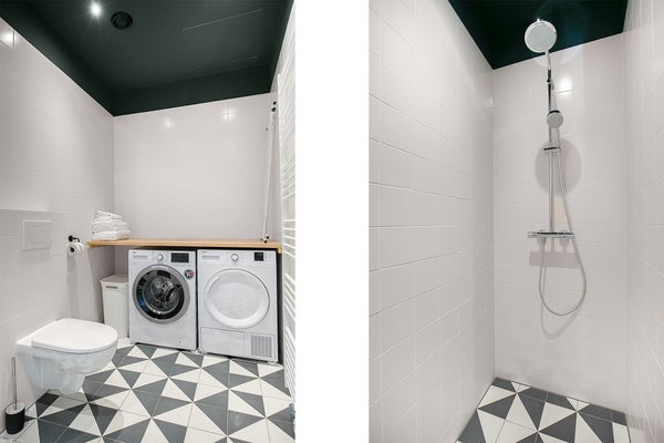Gestaltung Beim Betreten gelangen Sie direkt in das geschmackvoll eingerichtete Wohn- und Esszimmer. Das Wohnzimmer ist ausgestattet mit 4 luxuriösen Stühlen an einem runden Tisch, einem neuen Sofa und einem großen Flachbildfernseher. Die Küche ist mit hochwertigen Geräten und einer Waschmaschine ausgestattet. Auf den Fotos ist noch eine alte Situation zu sehen, in der keine Türen zwischen den Schlaf- und Wohnbereichen vorhanden sind. Diese werden bei der Übergabe vorhanden sein. Der Schlafbereich besteht aus einem Doppelbett im Hotelstil. Über diesem Bett wurde ein Schlafbereich für Kinder geschaffen. Dadurch entstehen 2 Schlafzimmer in 1. Das Badezimmer grenzt direkt daran und ist mit einer begehbaren Dusche, WC, Doppelwaschbecken und Waschmaschine ausgestattet.