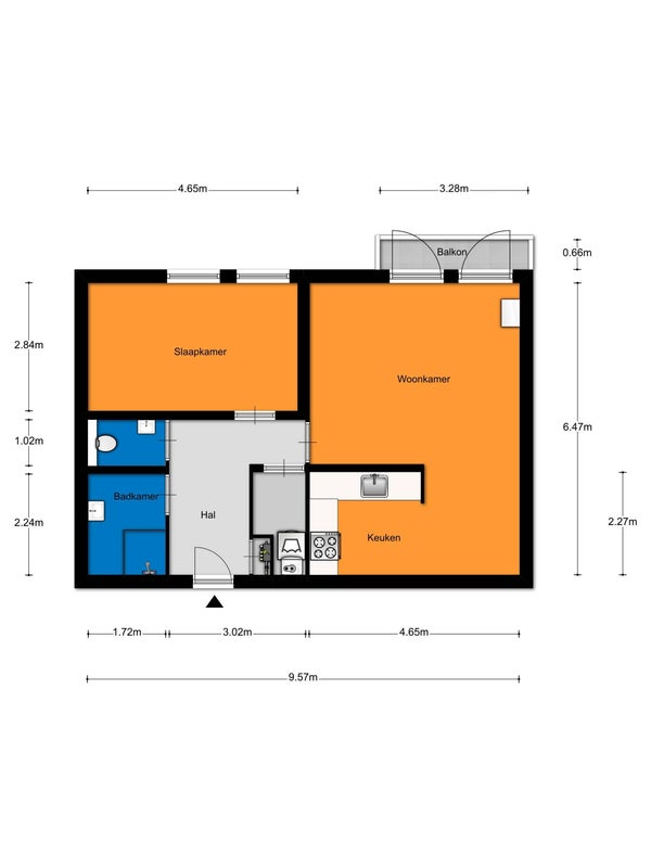 Hinter der Haustür gelangen wir zuerst in den Flur mit dem Stromkasten. Auf der linken Seite des Flures befindet sich das Badezimmer. Das Badezimmer ist mit einer Duschkabine, Waschbecken und Möbel ausgestattet. Vom Flur aus haben Sie Zugang zu einer separaten Toilette mit Waschbecken. Außerdem gibt es einen Abstellraum mit den Anschlüssen für Waschgeräte sowie den Wärmetauscher für die WKO und die mechanische Lüftung. Am Ende des Flures befindet sich das Wohnzimmer. Das Wohnzimmer ist in einen Ess- und einen Wohnbereich unterteilt. Durch zwei Doppeltüren haben Sie vom Wohnzimmer Zugang zum Balkon. Die offene Küche ist praktisch eingerichtet und hat eine L-Form mit ausreichend Stauraum, einem Elektrokochfeld und einem Dunstabzug. Das Schlafzimmer bietet genügend Platz für ein Doppelbett und einen großen Kleiderschrank.