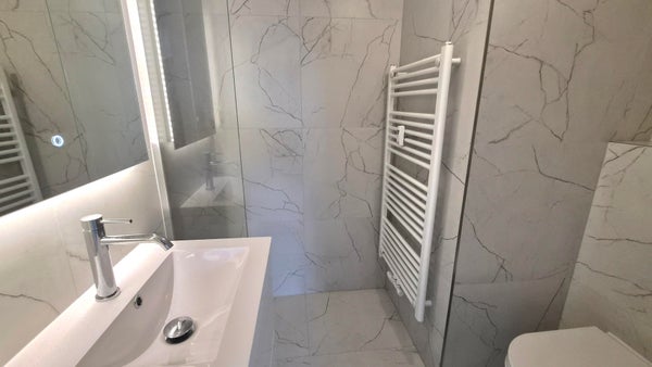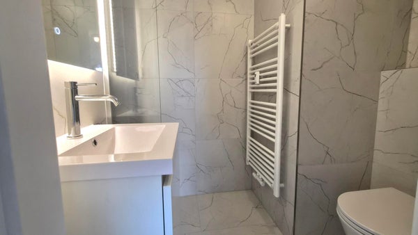 Wohnzimmer mit offener Küche. Die Küche ist ausgestattet mit einem 4-Flammen-Gasherd, Dunstabzugshaube, Kühlschrank und Kombi-Mikrowelle sowie einem Waschmaschinenanschluss. Darüber hinaus verfügt diese Wohnung über ein herrliches Schlafzimmer und ein luxuriöses Badezimmer, das mit einer Dusche, einem Waschbecken und einer Toilette ausgestattet ist.