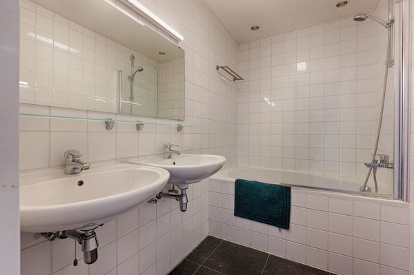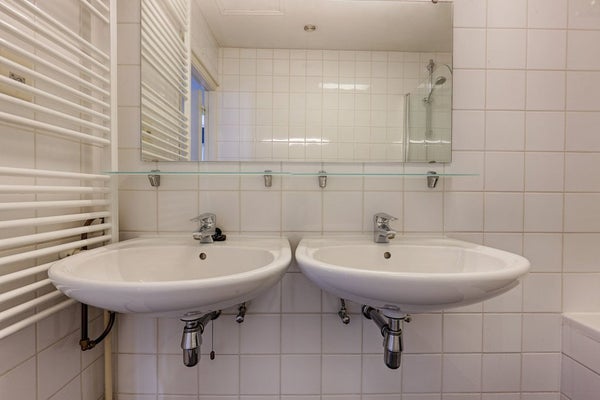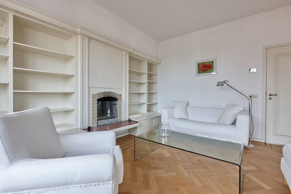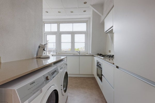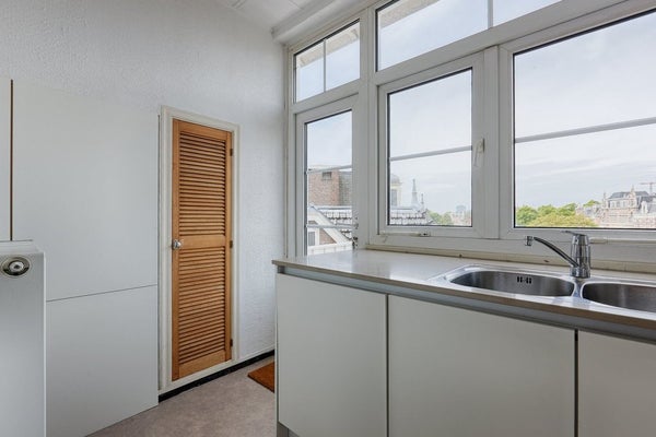 Das geräumige Wohnzimmer verfügt über große Fensterfronten, die für viel Tageslicht sorgen. Darüber hinaus gibt es einen gemütlichen Kamin und eine eingebaute Wandschrankwand. Vom Wohnzimmer aus gelangt man auf den ersten Balkon, der nach Süden ausgerichtet ist. Die moderne Küche ist mit allen notwendigen Einbaugeräten wie Kühlschrank und Gefrierschrank, Geschirrspüler, Backofen und Gasherd mit Dunstabzugshaube ausgestattet. Die Waschmaschine und der Trockner befinden sich ebenfalls hier. Die Küche bietet Zugang zum zweiten Balkon (SW) mit herrlichem Blick über das Sweelinckplein und die Stadt.