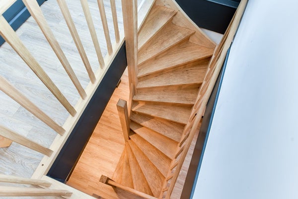 Treppen zu 2. Stock mit 2 geräumigen Schlafzimmern. Im Flur befindet sich eine weitere Toilette sowie ein Einbauschrank, ein Waschraum und Türen zur sonnigen Terrasse im Freien. Eine Leiter führt zur 3. Etage, die als Arbeitszimmer oder Gästezimmer fungieren kann. Das moderne Badezimmer hat eine Badewanne, eine begehbare Dusche, ein Waschbecken und einen Handtuchheizkörper.