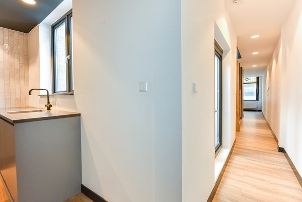 Eingang von der Straße in einen kleinen Flur mit der Tür zur Wohnung. Treppe in die erste Etage. Geräumiges Wohnzimmer mit großen Fenstern und schönen Holzverarbeitungen. Zugang zur ersten Terrasse, Flur zum modernen WC mit Wasserhahn. Zugang zum Ess- / Küchenraum mit einer brandneuen Küche mit Geräten wie einem Ofen, Mikrowelle, Geschirrspüler, Quooker (kochendes Wasser aus dem Wasserhahn) und ausreichend Stauraum.