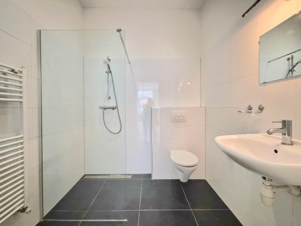 Darüber hinaus ist diese Wohnung mit einem modernen und geräumigen Badezimmer von ca. 1,94 x 2,12 mit begehbarer Dusche, Waschbecken, WC und Handtuchheizkörper ausgestattet.