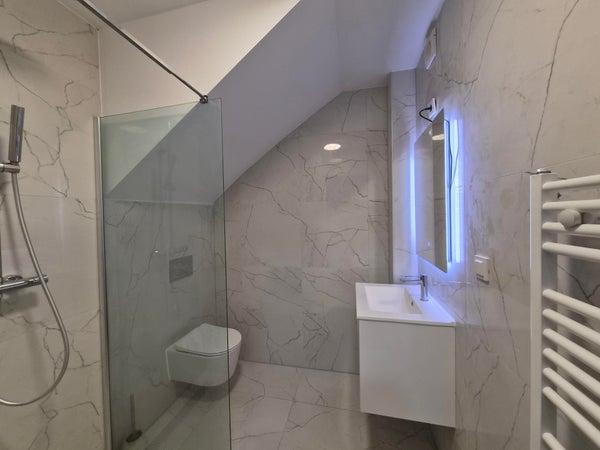 Im Wohnzimmer haben Sie Zugang zu einem praktischen Abstellraum, neben dem Keller. Außerdem verfügt diese Wohnung über ein geräumiges modernes Badezimmer, das mit einer Badewanne, einer separaten Dusche, einem Waschbecken, einer Toilette, einer Waschmaschine und einem Handtuchheizkörper ausgestattet ist.