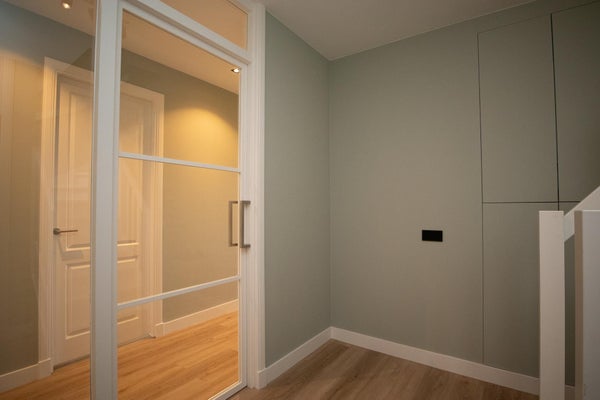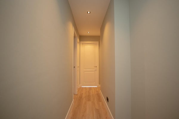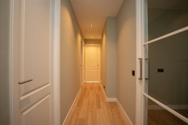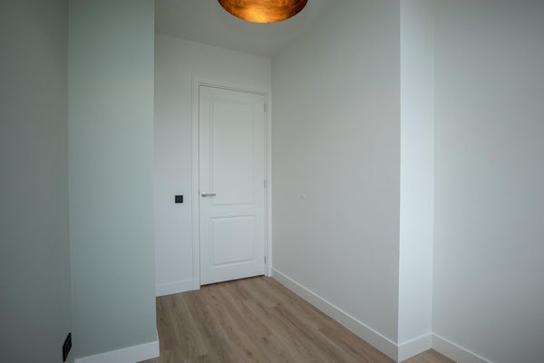 Eingang mit Garderobe hinter der Tür und Zählerkasten. Durch zwei stilvolle Stahltüren gelangt man in den Flur, der Zugang zum geräumigen Schlafzimmer (5,65 x 3,48) mit angrenzendem luxuriösen Badezimmer bietet, ausgestattet mit einer Badewanne, Walk-In-Dusche und Toilette.
