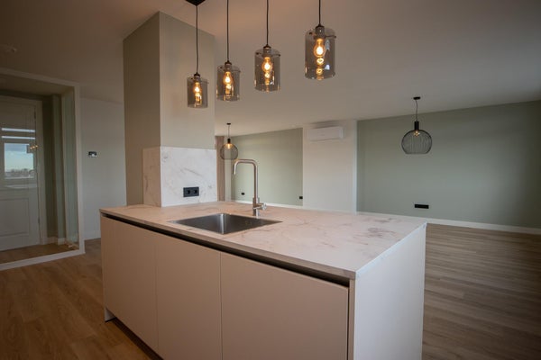 Diese Etage verfügt über das helle und geräumige Wohnzimmer mit offener Küche - 62,6m(!), ein separates WC und Zugang zur großen Dachterrasse von 20,9m2. Das geräumige Wohnzimmer ist erneut durch elegante Stahltüren zugänglich und profitiert von einem angenehmen freien Blick aufgrund seiner Position im Haus. Es verfügt über Klimaanlage, Fußbodenheizung und den gleichen hochwertigen Bodenbelag, der im ganzen Haus zu finden ist. Vom Wohnzimmer aus hat man direkten Zugang zur sonnigen Dachterrasse – ein idealer Platz zum Entspannen.
