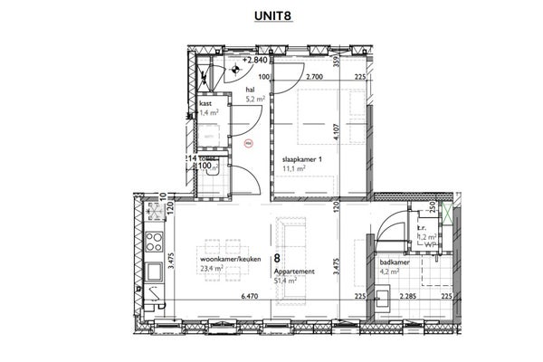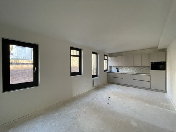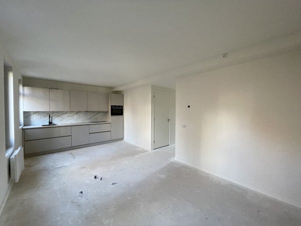 Es handelt sich um eine 2-Zimmer-Wohnung im 1. Stock. Beim Betreten gelangt man in den Flur, der Zugang zu einem Schrank mit dem Anschluss für die Waschmaschine bietet. Das Wohnzimmer liegt zur Kleinen Overstraat hin und verfügt über eine offene Küche, die mit einem Induktionskochfeld, Dunstabzugshaube, Geschirrspüler, Kombi-Mikrowelle und einem Kühlschrank mit Gefrierfach ausgestattet ist. Die Wohnung verfügt außerdem über eine separate Toilette und ein Badezimmer mit einem Waschbecken und einer Dusche. Das Badezimmer hat moderne graue Bodenfliesen im Betonlook und weiße Wandfliesen.